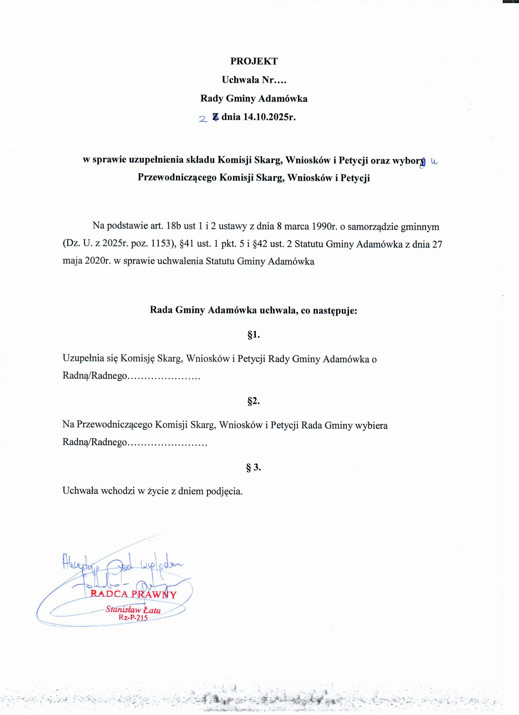Podjęcie uchwały w sprawie uzupełnienia składu Komisji Skarg, Wniosków i Petycji oraz wybór jej Przewodniczącego