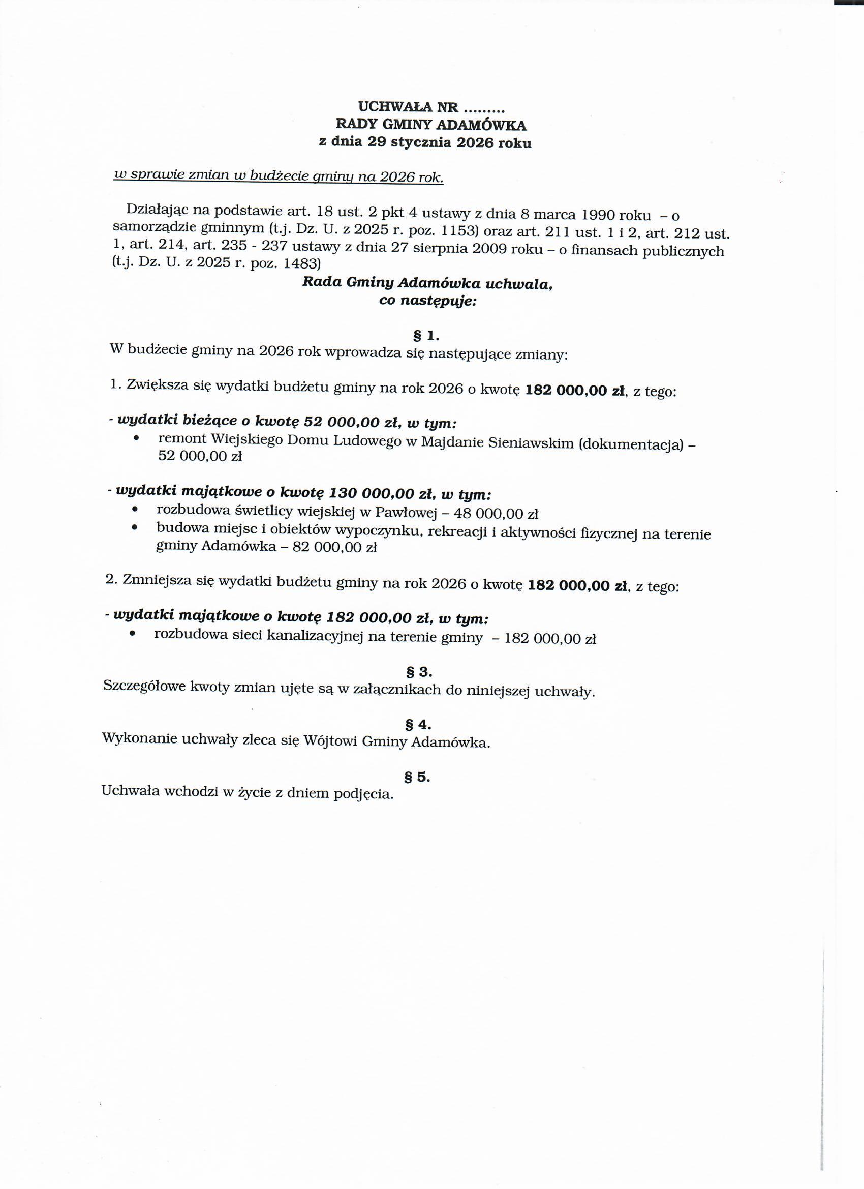 Podjęcie uchwały w sprawie zmiany uchwały budżetowej Gminy Adamówka na 2026 rok.
